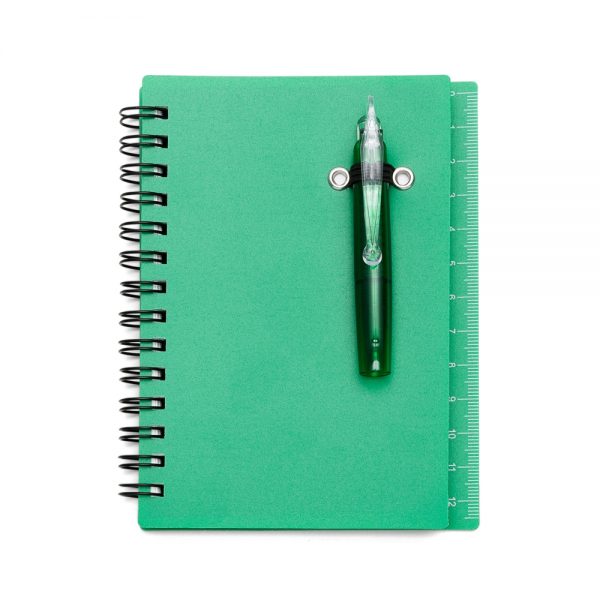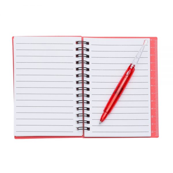 Bloco de anotações plástico com post-it, mini caneta e régua de 12cm na lateral. Possui espiral preto, suporte elástico na capa para mini caneta(basta levantar o “clip” para acioná-la), cinco blocos auto colantes com aproximadamente 20 folhas cada, bloco amarelo com aproximadamente 25 folhas e 50 folhas aproximadamente brancas pautadas.