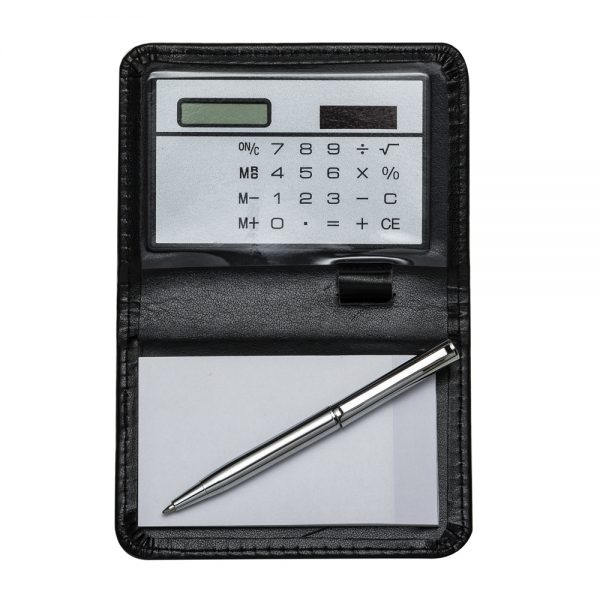 Bloco de anotações com calculadora. Bloco couro sintético com suporte plástico para calculadora, suporte em couro com uma caneta plástica prata de clip metal(aciona por giro), bloco com aproximadamente 25 folhas brancas sem pauta e calculadora solar 8 dígitos prata com detalhes preto.