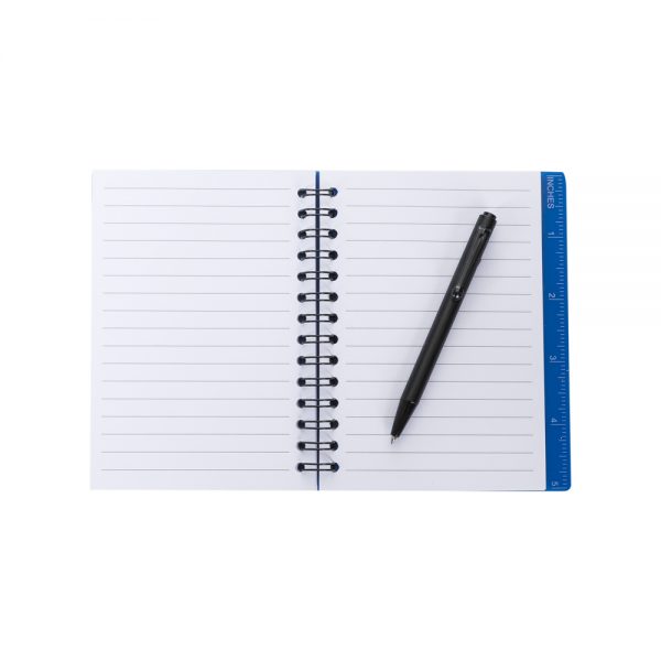 Bloco de anotações plástico, possui régua com a medida de polegada e acompanha uma caneta plástica preta sustentada por um elástico na capa. PEDIDO APENAS MÚLTIPLO DE 100 PEÇAS!