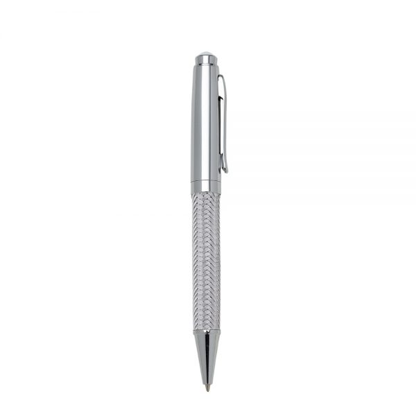 Caneta metal prata com 3 versões. Clip metal e ponta superior colorida, tem as versões couro branco, couro preto, e prata texturizado. Aciona por giro.