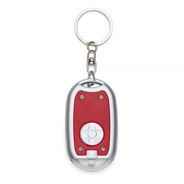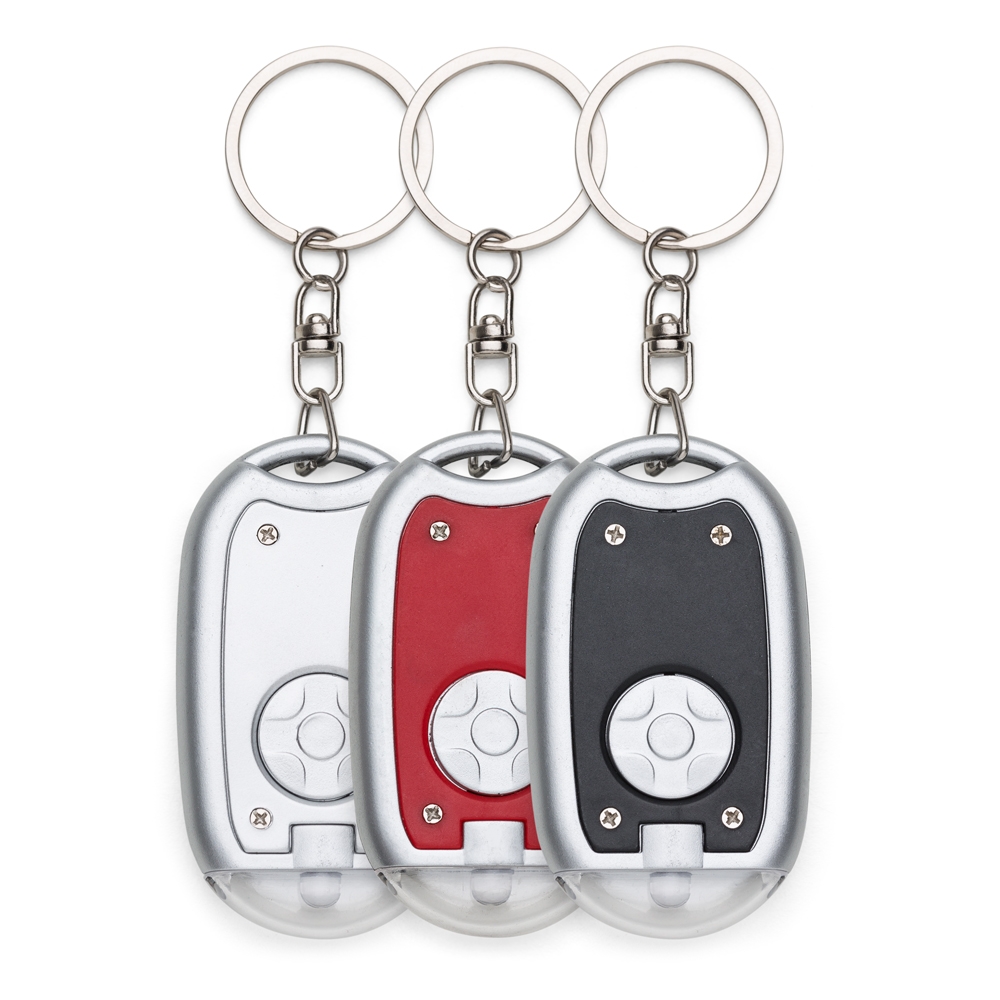 Chaveiro lanterna plástico, parte central colorida lisa e verso com botão para acionar lanterna. Possui as laterais em prata e lanterna com proteção acrílica, acompanha 3 baterias(duas LR1130 e uma CNB G10).